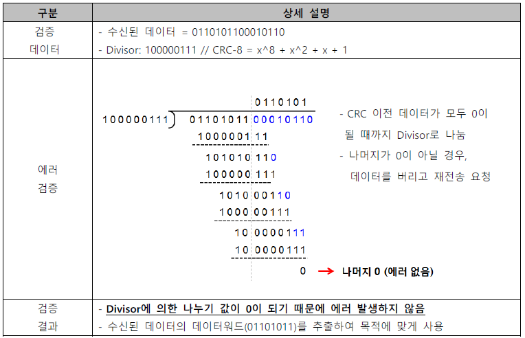 - 송신 : CRC 생성(Data + CRC 전송), 수신 : Divider 이용(나머지 값 확인)