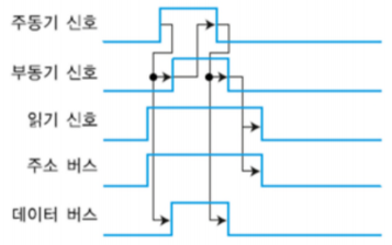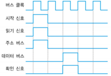 읽기동작 | 1. 버스마스터가 버스 사용권 획득 후, 주소 버스로 해당 장치 주소 전달 2. 이와 동시에 제어 버스를 통해 읽기 신호 전달 3. 데이터 버스를 통해 목적한 데이터가 수신될 때까지 대기 |