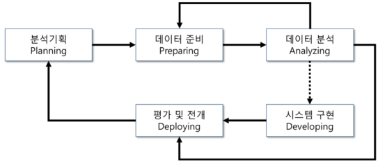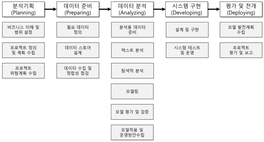 - 분석기획(Planning), 데이터 준비(Preparing), 데이터 분석(Analyzing), 시스템 구현(Developing), 평가 및 전개(Deploying)으로 진행됨